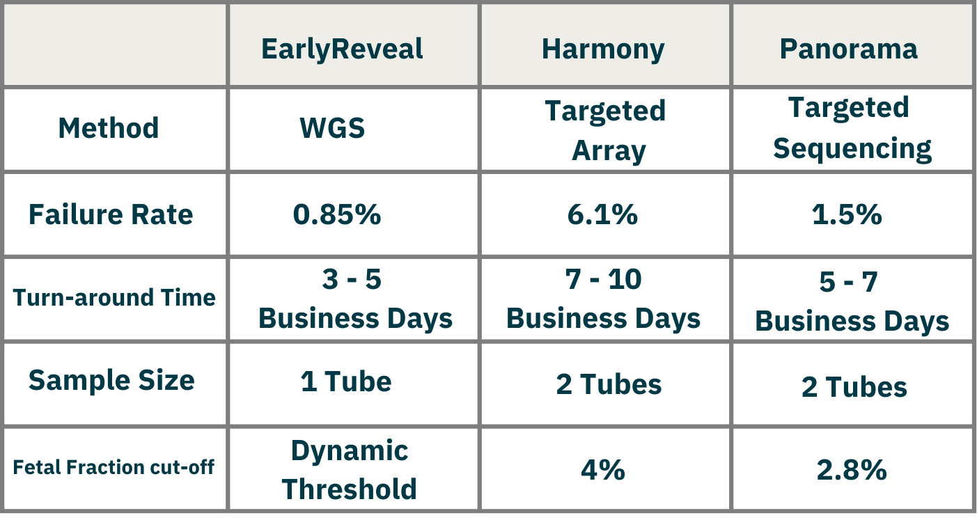 Remarque: Le NIPS EarlyReveal est un test de dépistage ; tout résultat positif (test positif ou risque élevé) devrait être confirmé par un test diagnostique, tel que l’amniocentèse.